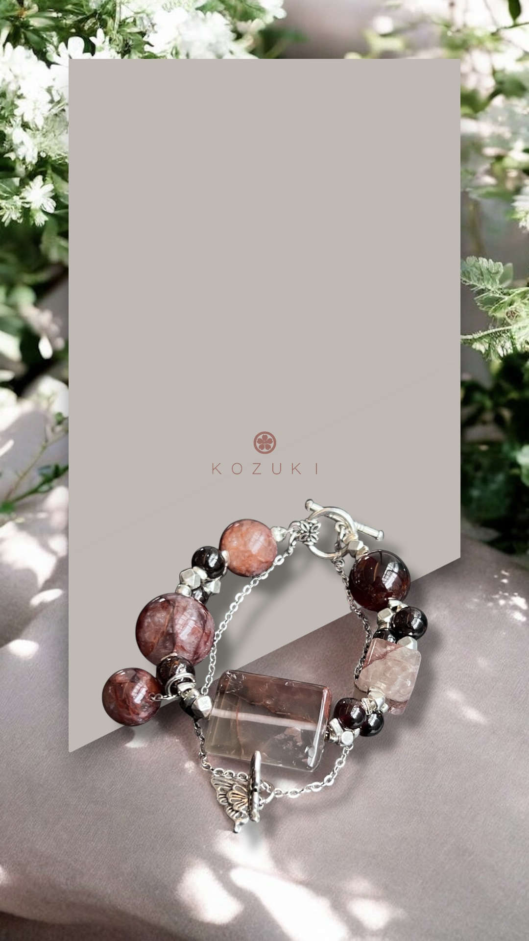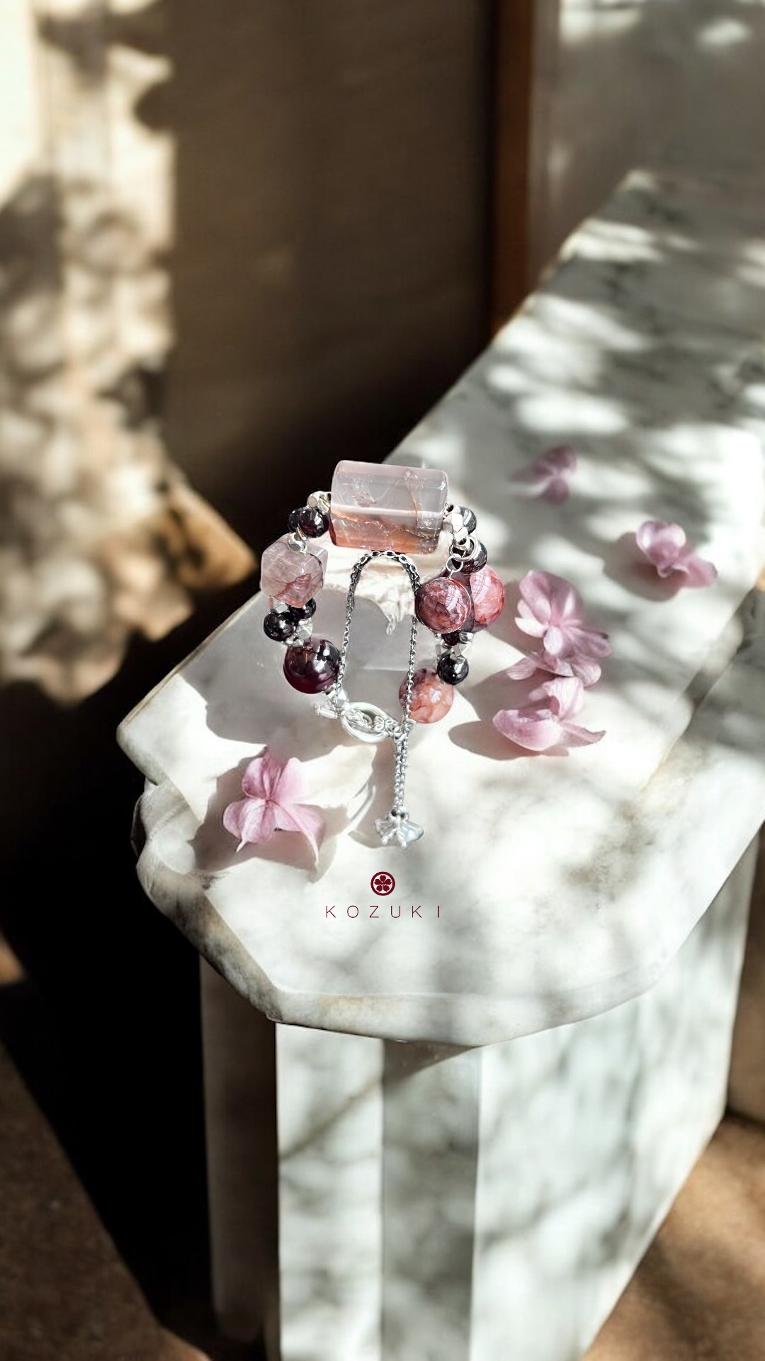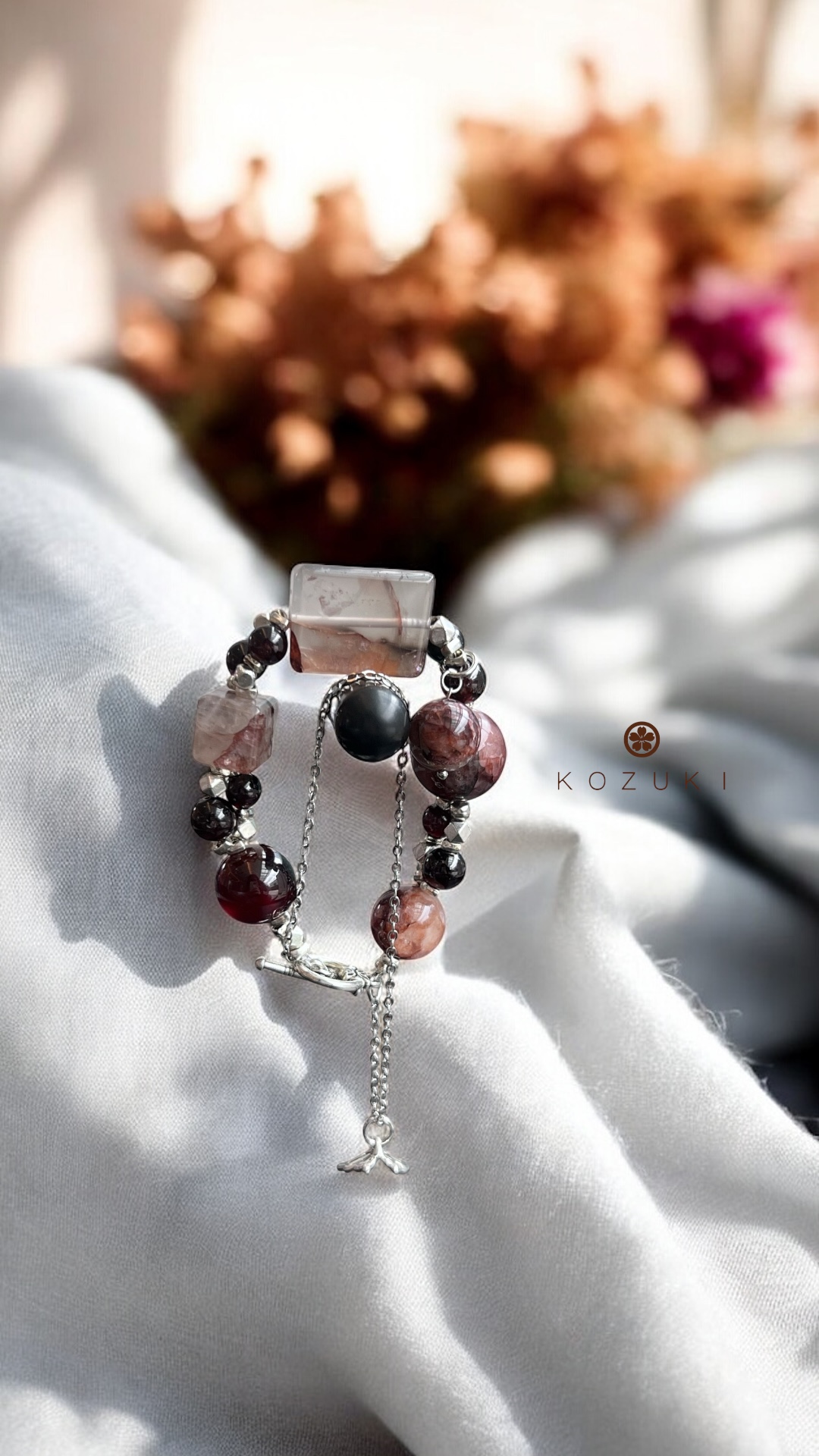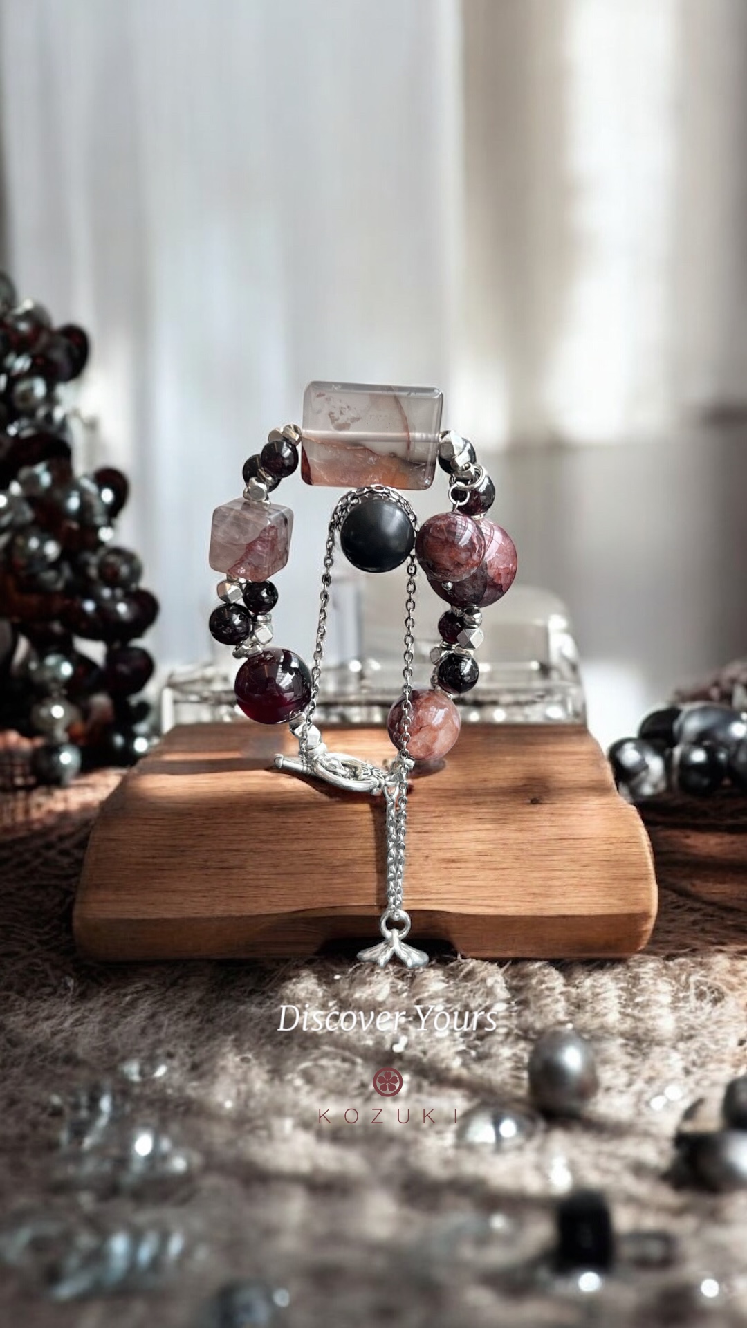 ガーネットとレッドクォーツが静かに脈打ち、クリアクォーツが全体のバランスを整えます。芸術性とエネルギーを兼ね備えた、洗練された一点です。